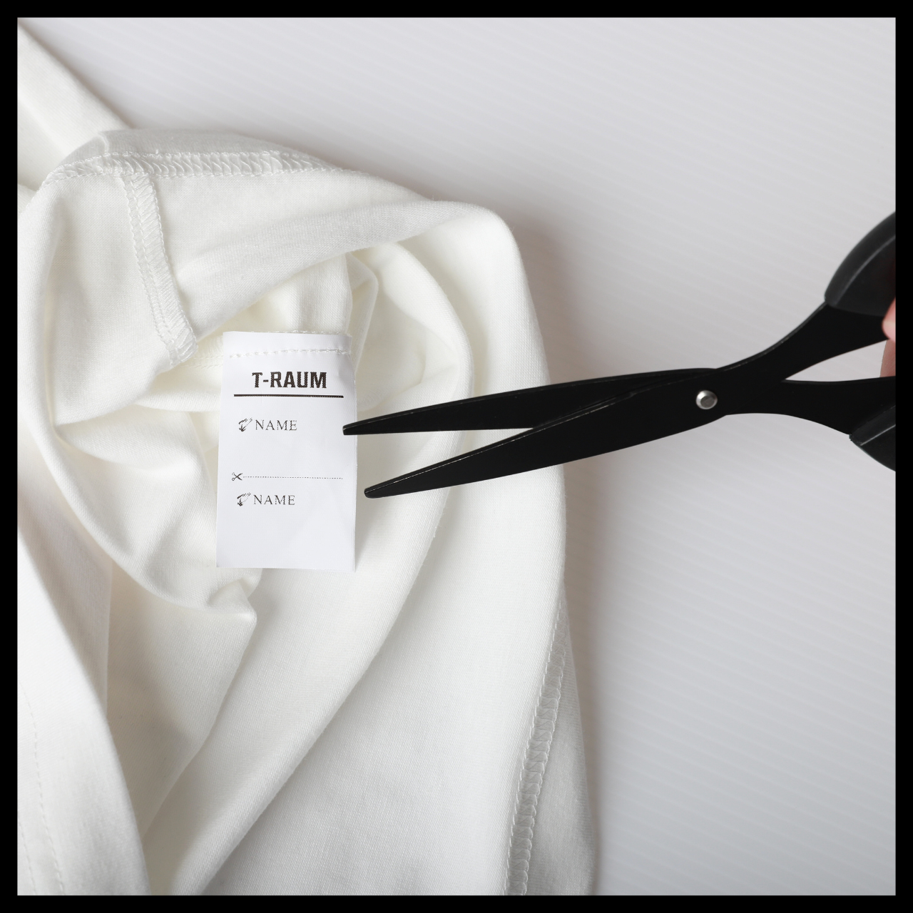 後ろ襟ぐりの縫い代には肌に優しいテープ始末を施し、首元にはネームタグやブランドタグを排除。サイズがひと目でわかるプリントを施し、シンプルさと機能性を両立させました。
