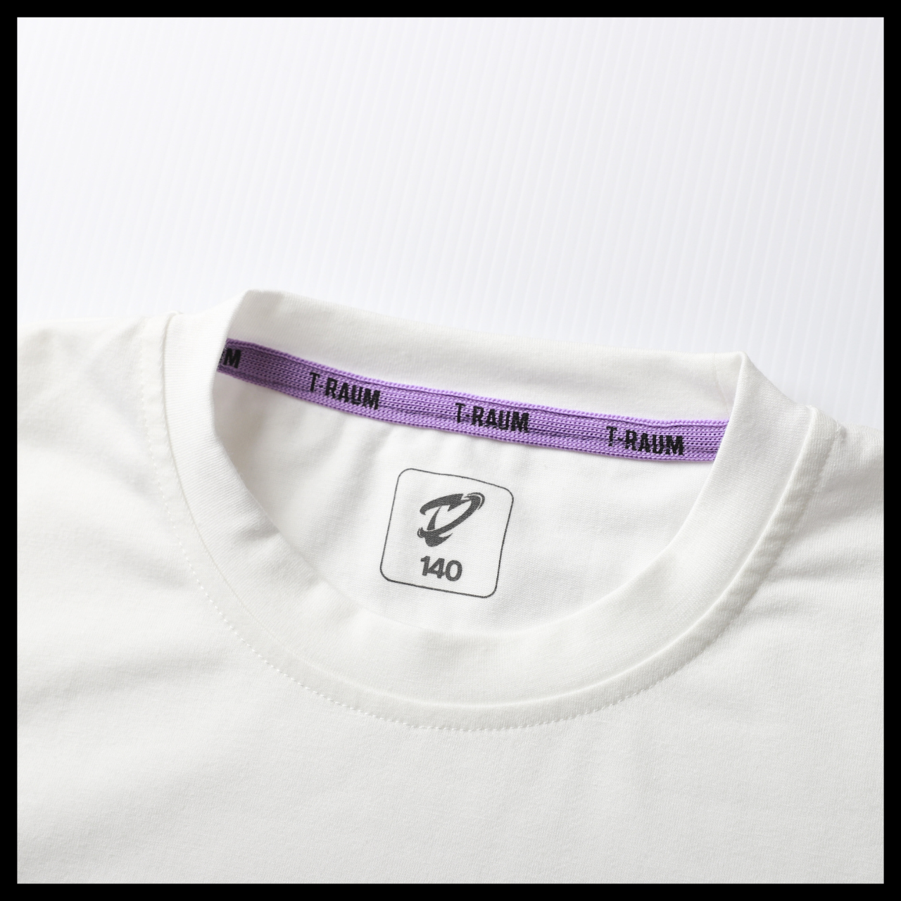 後ろ襟ぐりの縫い代は、肌当たりの良いテープ始末。首元にはネームタグやブランドタグを使用せず、サイズが一目で分かるプリントを施しました。